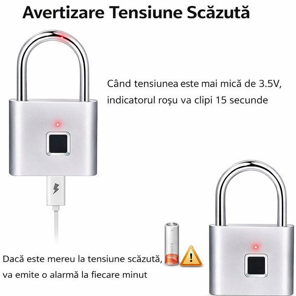 Lacătul se încarcă ușor prin cablu USB. O încărcare completă poate dura câteva săptămâni, asigurând funcționarea continuă.